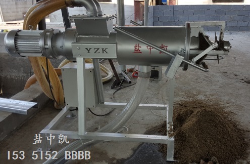 豬糞經專用無堵塞切割泵將豬糞跟污水一起抽進處理機內,再由不銹鋼擠壓絞龍將豬糞污水逐漸推向機體前方,同時不斷提高前緣的壓力, 迫使物料中的水分在邊壓帶濾的作用下擠出網篩,流出排水管。豬糞處理機工作是連續的, 其物料不斷泵入機體,前緣的壓力不斷增大,當大到一定程度時, 就將卸料口頂開, 擠出出料口,達到擠壓出料的目的。為了掌握出料的速度與含水量, 可以調節主機兩邊配重塊的位置,以達到滿意適當的出料態。